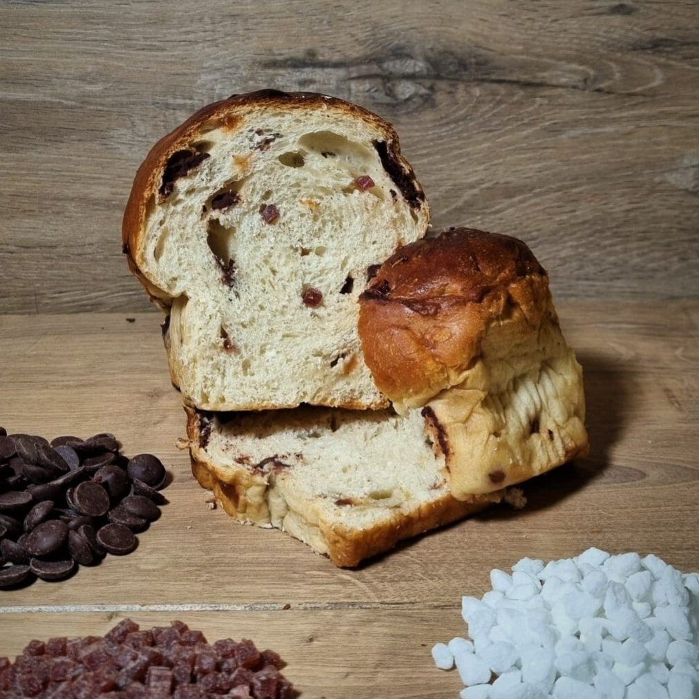 Zeer rijk gevuld suiker brood met gedroogde aardbei, pure chocolade en natuurlijk suiker.